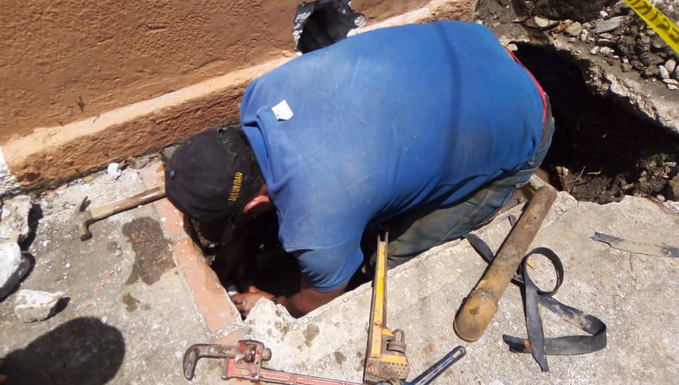Los trabajadores de la hidrológica realizaron la excavación en el área externa del edificio para efectuar la corrección de la avería de agua potable en la toma multifamiliar e instalar posteriormente 2 uniones rápidas de PEAD de 63 milímetros, un adaptador macho de PEAD de 63 milímetros x 2 pulgadas y dos válvulas de compuerta de bronce roscada.