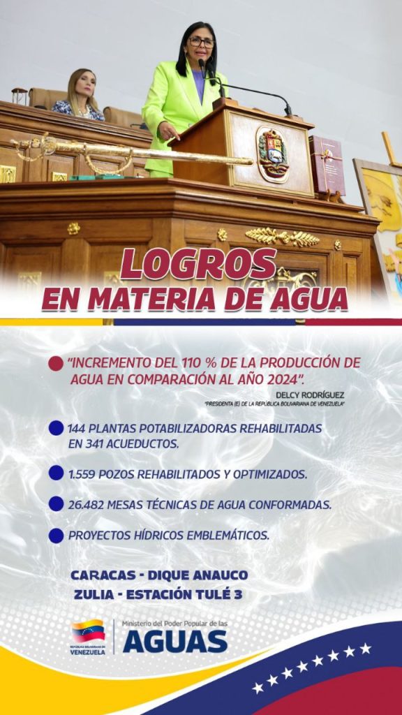 (Prensa Ministerio de las Aguas – 15-01-2026).- La Presidenta Encargada de la República Bolivariana de Venezuela, Delcy Rodríguez, desde la Asamblea Nacional de Venezuela, informó en el Mensaje Anual de la Nación, que el Ministerio del Poder Popular de Atención de las Aguas logró un incremento del 110 % en las acciones relacionadas con la gestión del recurso hídrico respecto al año anterior en todo el territorio nacional.