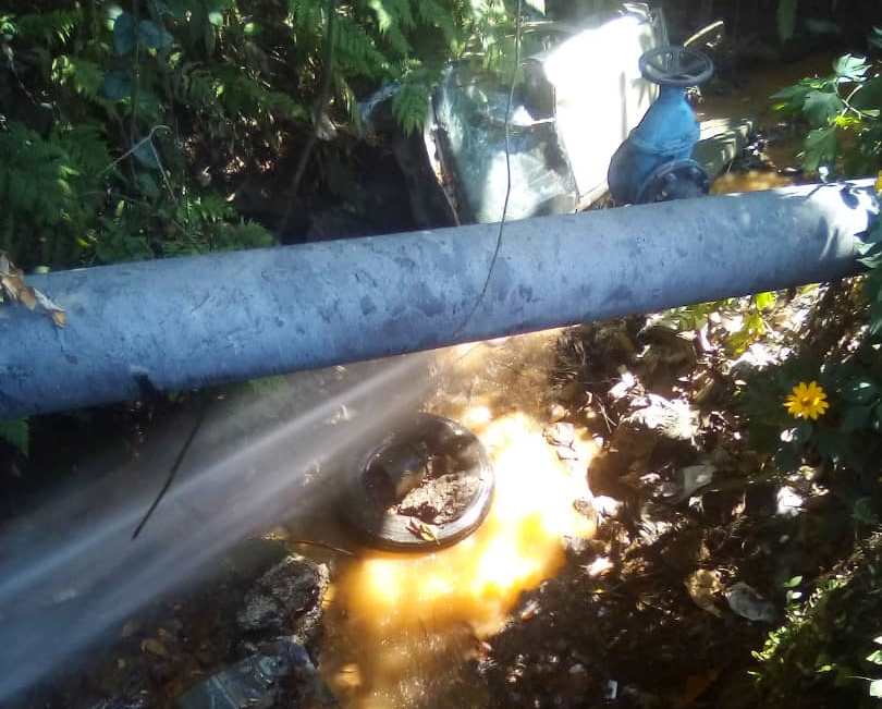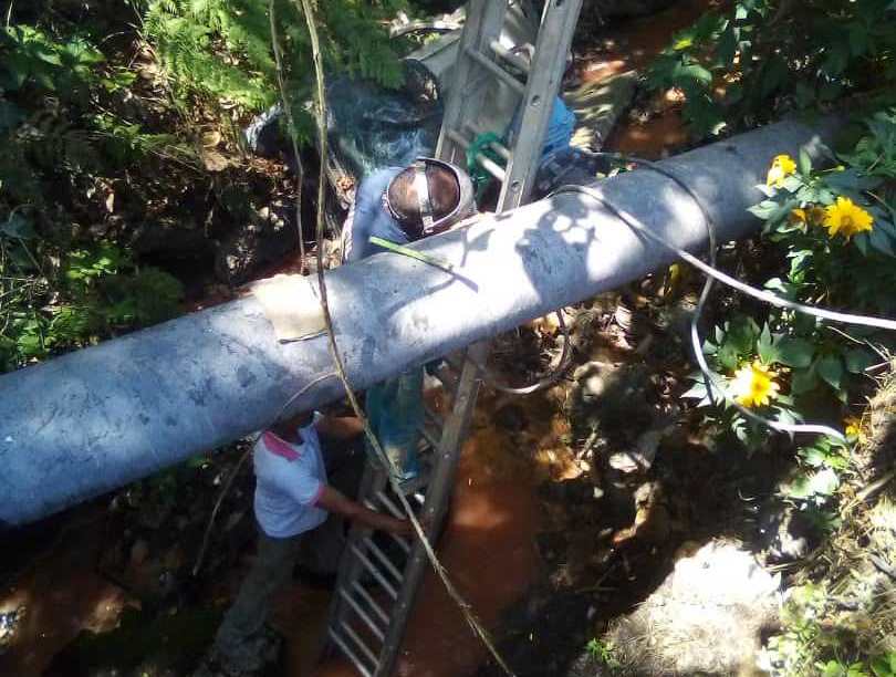 Otra de las zonas donde se efectuó reparación en la red de distribución de agua potable fue en las adyacencias de la descarga de la Laguna El Vaquiro, donde fue detectado un poro en el ducto del vital líquido. En el lugar, la cuadrilla de soldadura procedió a instalar una plancha de acero para evitar la pérdida del agua potable.