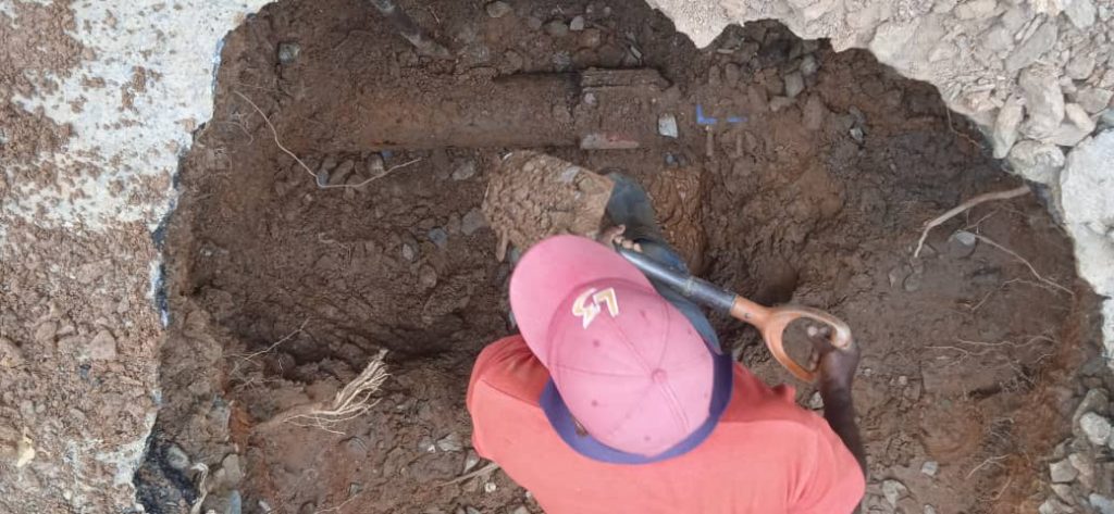 Durante los trabajos de reparación fue ubicada una tubería de 6 pulgadas que presentaba un poro; el personal técnico de la hidrológica procedió a fabricar un niple, el cual se empleó con dos juntas mecánicas para sustituir el tramo de la aducción afectado.