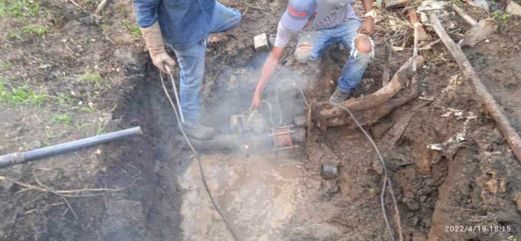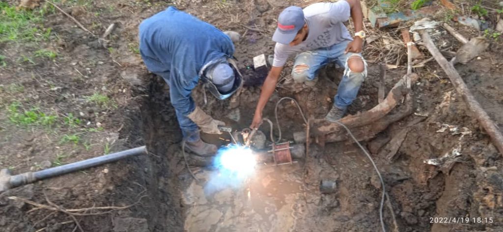 La fuerza trabajadora del agua detectó en dicha aducción una fuga por deterioro en la tubería debido al terreno saturado, razón por la cual procedió a efectuar trabajos soldadura y reparación, colocando una junta de 4″ con un tapón de acero de 4″ y anclajes en manguera PEAD de 110 mm de 4″, para que la presiones no permitan movimiento y las junta cumpla su función.