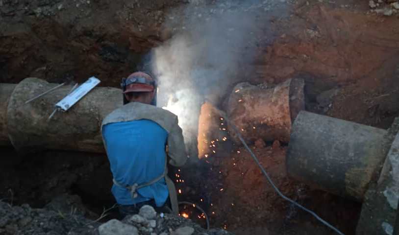 (Prensa MinAguas/Hidrocapital 08-06-2022).- Personal del Acueducto Altos Mirandinos de Hidrocapital, ente adscrito al Ministerio del Poder Popular de Atención de las Aguas, atendió una avería en la aducción principal de agua potable que suministra el vital líquido a la parroquia San Pedro y a parte de la ciudad de Los Teques, municipio Guaicaipuro del estado Miranda, luego de que esta tubería de 20″ sufrió una rotura en uno de sus codos.