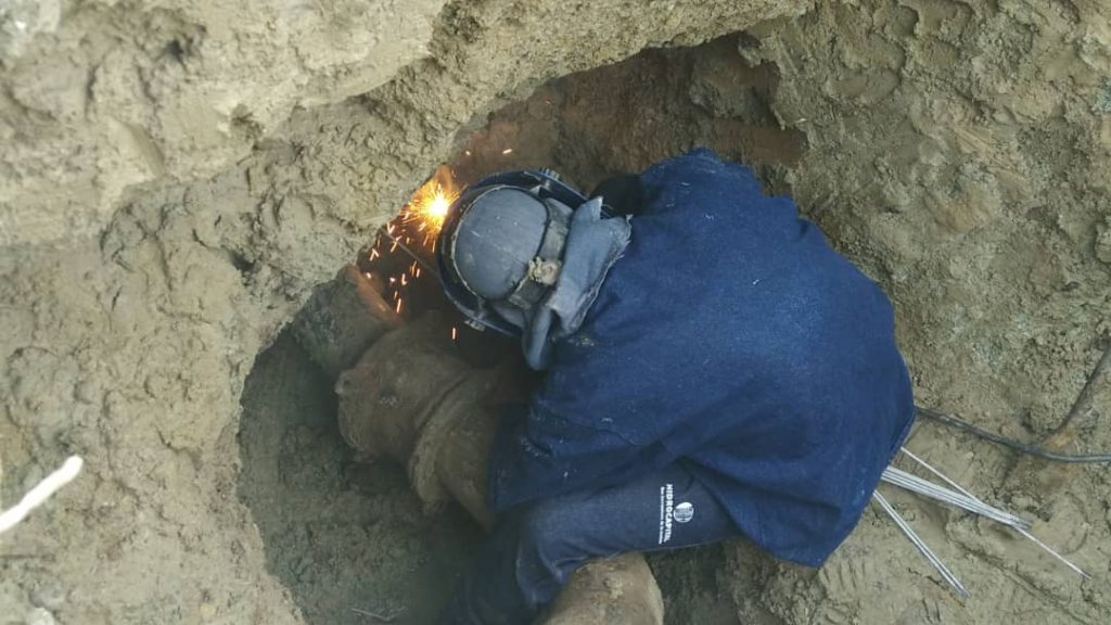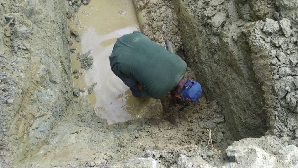 De esta manera, se realizaron tres excavaciones encontrando dos fallas que provenía de las tuberías que surte los tanques de esta comunidad. Seguidamente el equipo hídrico procedió a realizar el corte de la tubería afectada sustituyéndolo por un niple de 50cm de 6” en material de acero y dos juntas de 6“.