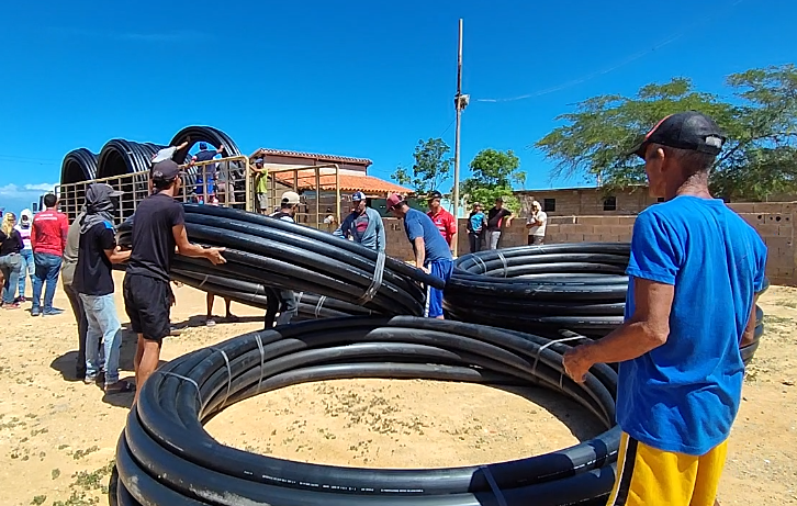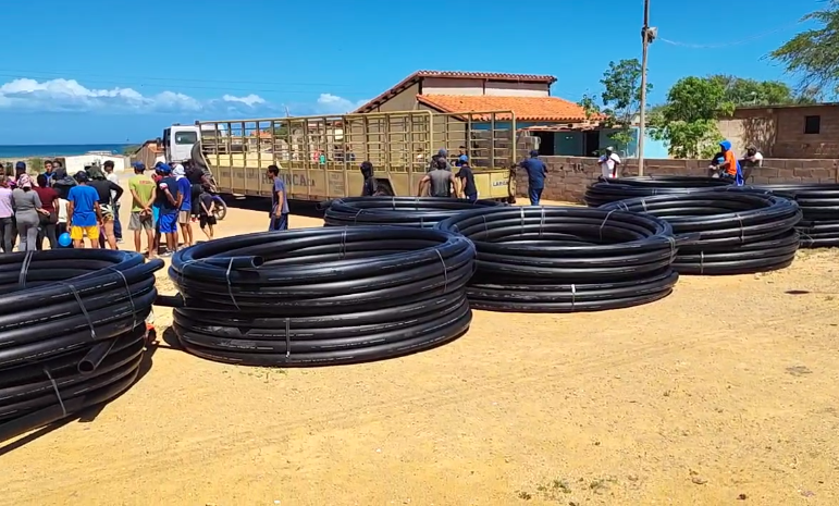 (Prensa MinAguas 25-01-2024).- El ministro del Poder Popular de Atención de las Aguas, G/D Rodolfo Marco Torres, junto con el gobierno del estado Sucre, encabezado por Gilberto Pinto, a través del alcalde del municipio Cruz Salmerón Acosta, Daniel Ruíz, entregaron este jueves 25 de enero una dotación de 15 rollos, para un total de mil 500 metros de tubería de Polietileno de Alta Densidad (PEAD) para fortalecer la atención al 1×10 del Buen Gobierno en la comunidad de El Rincón, ubicada en la localidad nororiental de Araya.